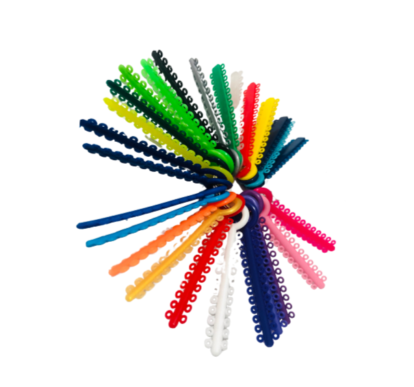 Son pequeños elásticos que se utilizan en los brackets para sujetar el arco de alambre y aplicar fuerza para mover los dientes hacia su posición correcta durante el tratamiento ortodóntico. Variedad de colores.